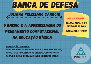 É com grande satisfação que o Mestrado Profissional em Matemática em Rede Nacional – PROFMAT/UFMS torna pública a Banca de Defesa da Mestranda Juliana Pelissaro Carboni.